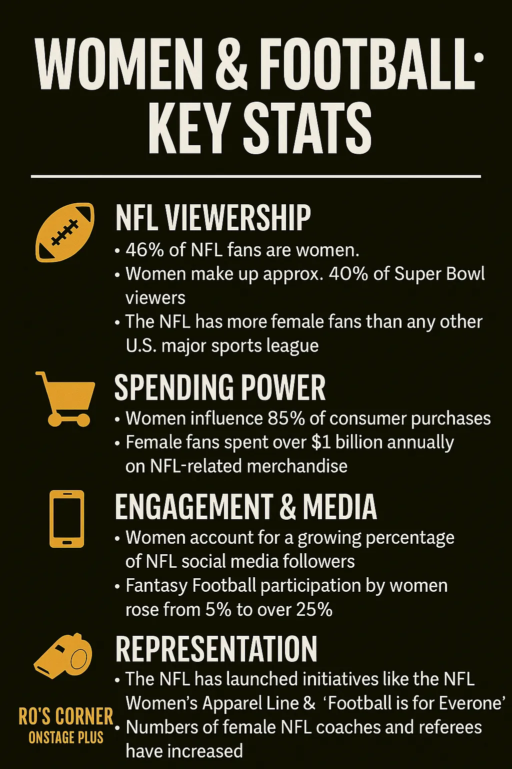 Ro’s Corner is where football meets fierce female energy! With nearly half of NFL fans being women, your brand can tap into a smart, engaged, and loyal audience that’s often overlooked. Hosted by media pro Roketa Raiford, the show delivers weekly NFL insights that entertain and educate—making it the perfect place to build trust, boost visibility, and align with a bold, culture-driven sports platform on OnStage PLUS.